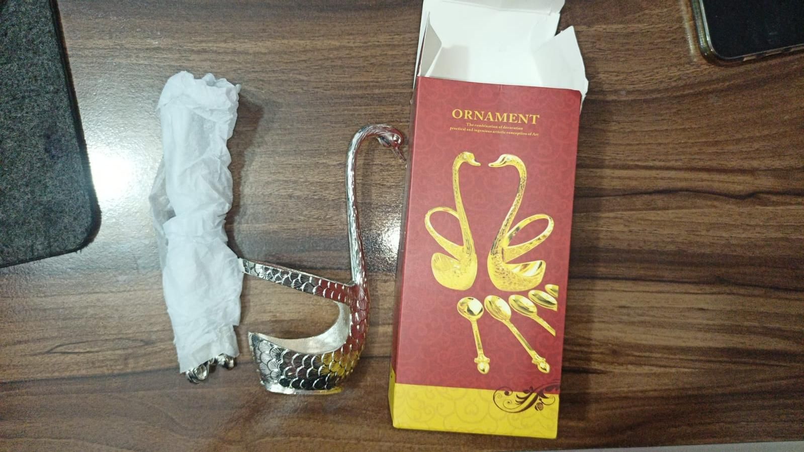 Additional Information:  Item: Pure Source India Metal Fork Set With Swan Base Holder for Coffee, Fruit, Desserts, Ice Cream, and Cake (15cm).  Hand Made Beautiful Designs and Patterns at the Nodes. This dessert fork kit is a great gift choice for friends and families, especially for cook lovers. It is a perfect companion for the afternoon tea, enjoy your delicacy with this beautiful spoon set.